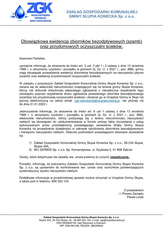 Obowiązkowa ewidencja zbiorników bezodpływowych (szamb) oraz przydomowych oczyszczalni ścieków.