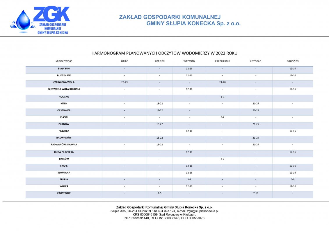 Zakład Gospodarki Komunalnej Gminy Słupia Konecka informuje, że od 01.02.2022 roku na terenie gminy Słupia Konecka odczyty wskazań wodomierzy będą dokonywane zdalnie. Wodomierze wyposażone są nakładki radiowe przystosowane do zdalnego odczytu. W przypadku konieczności nasz pracownik może dokonać odczytu fizycznie w miejscu jego wbudowania.